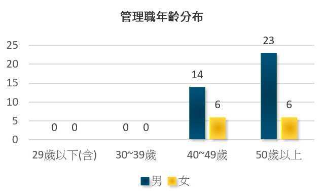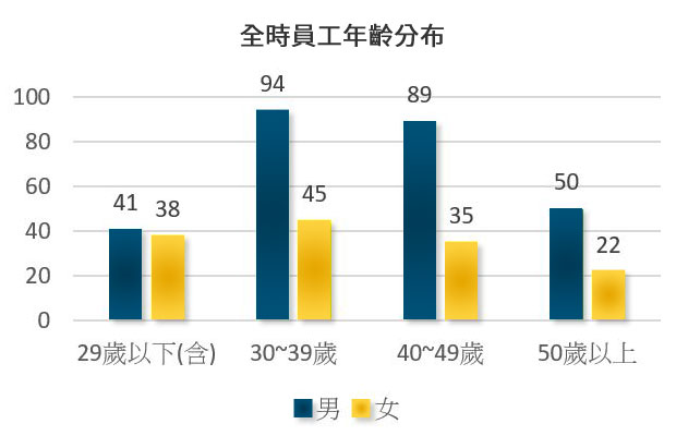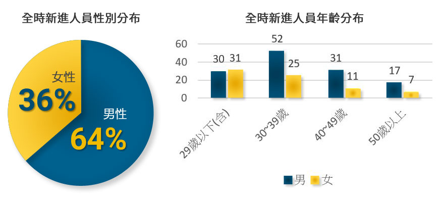 新進人員女性員工比例約36%,與全時員工女性比例24%相比,顯示公司在進用女性員工政策有逐漸提升趨勢。員工平均年齡為39歲且新進同仁之年齡分布以39歲以下佔68%,加快企業人才儲備之腳步。